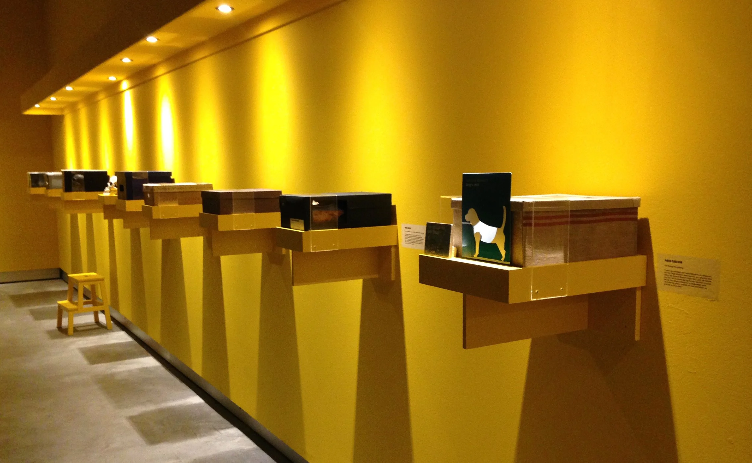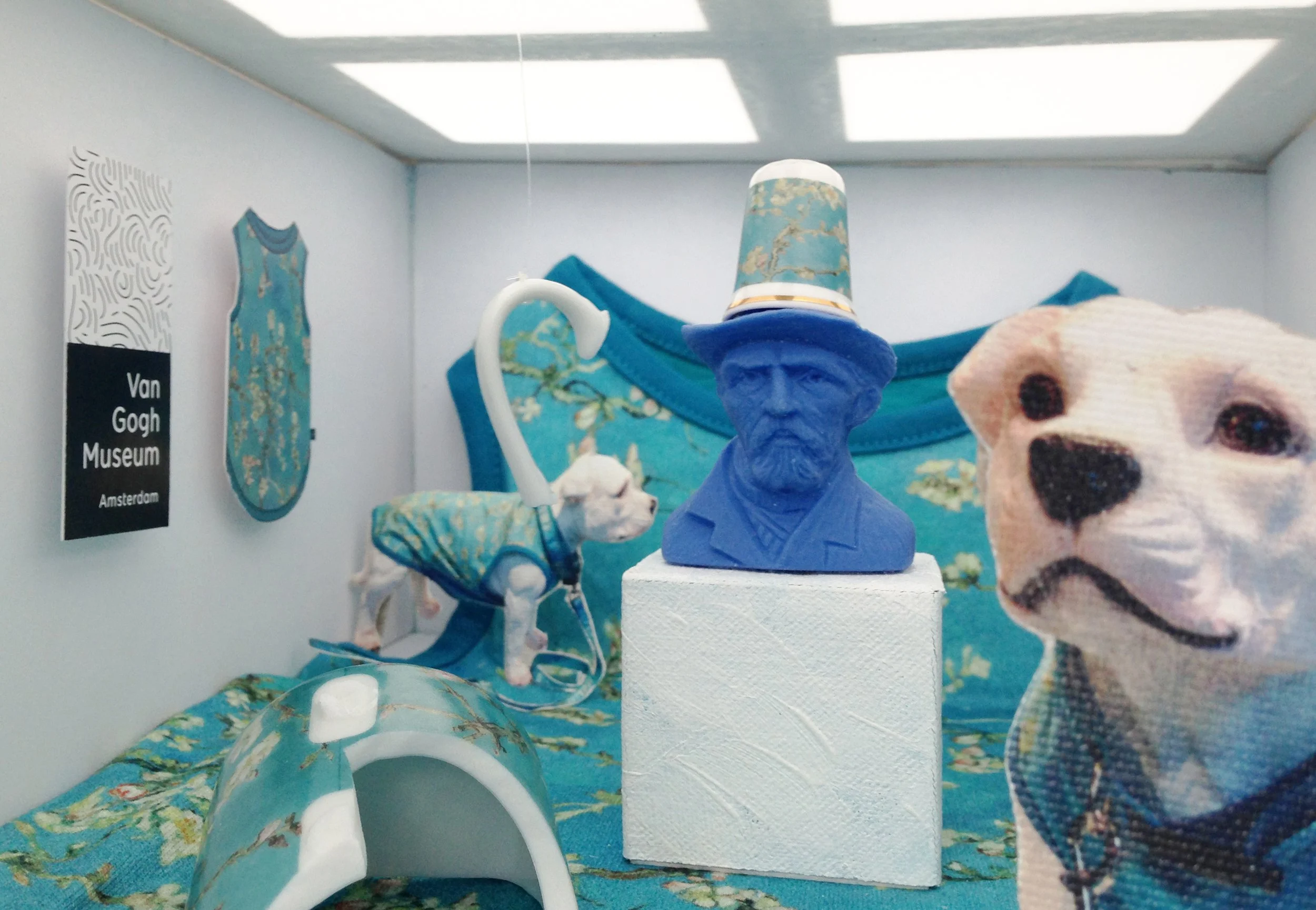 Inside the box: the dog shirt, two cut-out model dogs wearing it, a broken tea cup - the ear hanging in the space-, an almond blossom thimble, and an eraser in the shape of Vincent’s buste on a tiny pedestal.