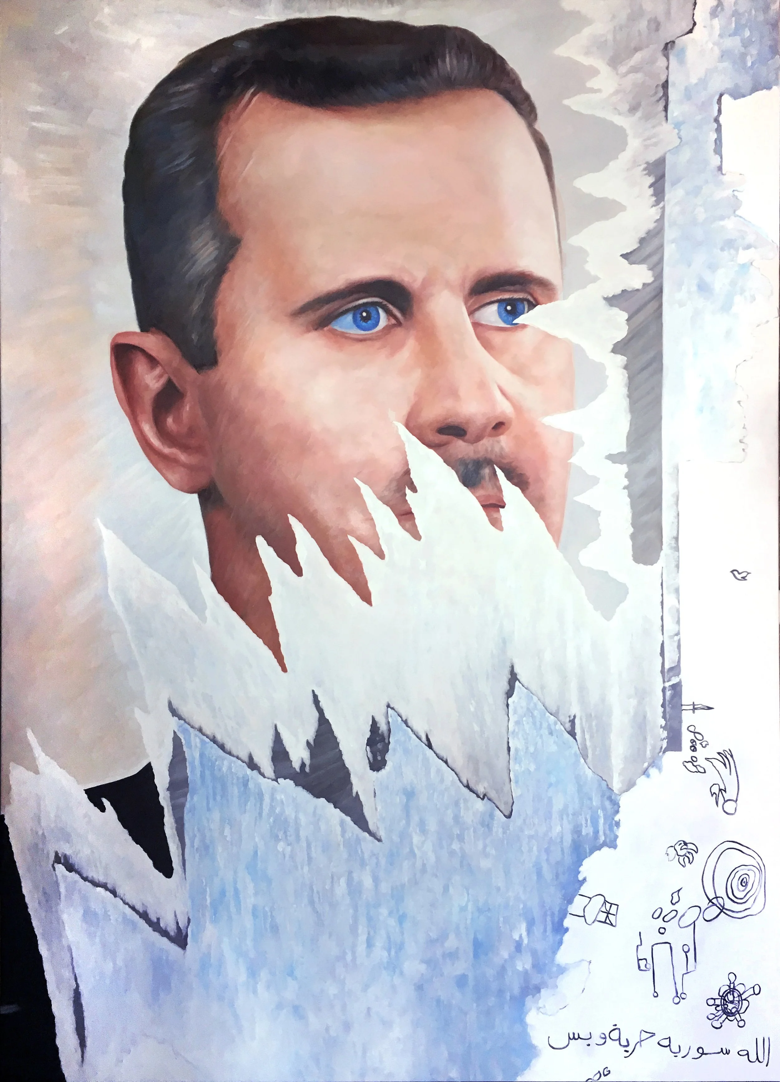 250,000 people were killed in the Syrian war until 2016. This painting shows a propaganda image of the ‘Slaughterer of Damascus’ Bashar al-Assad, but the image is torn like a poster and will be torn more and more until it’s gone. In the lower right corner the drawings by Taim Safar, an eleven-year-old Syrian refugee and texts from the people for a free Syria. Those will eventually grow and take over. The pen is mightier than the sword.