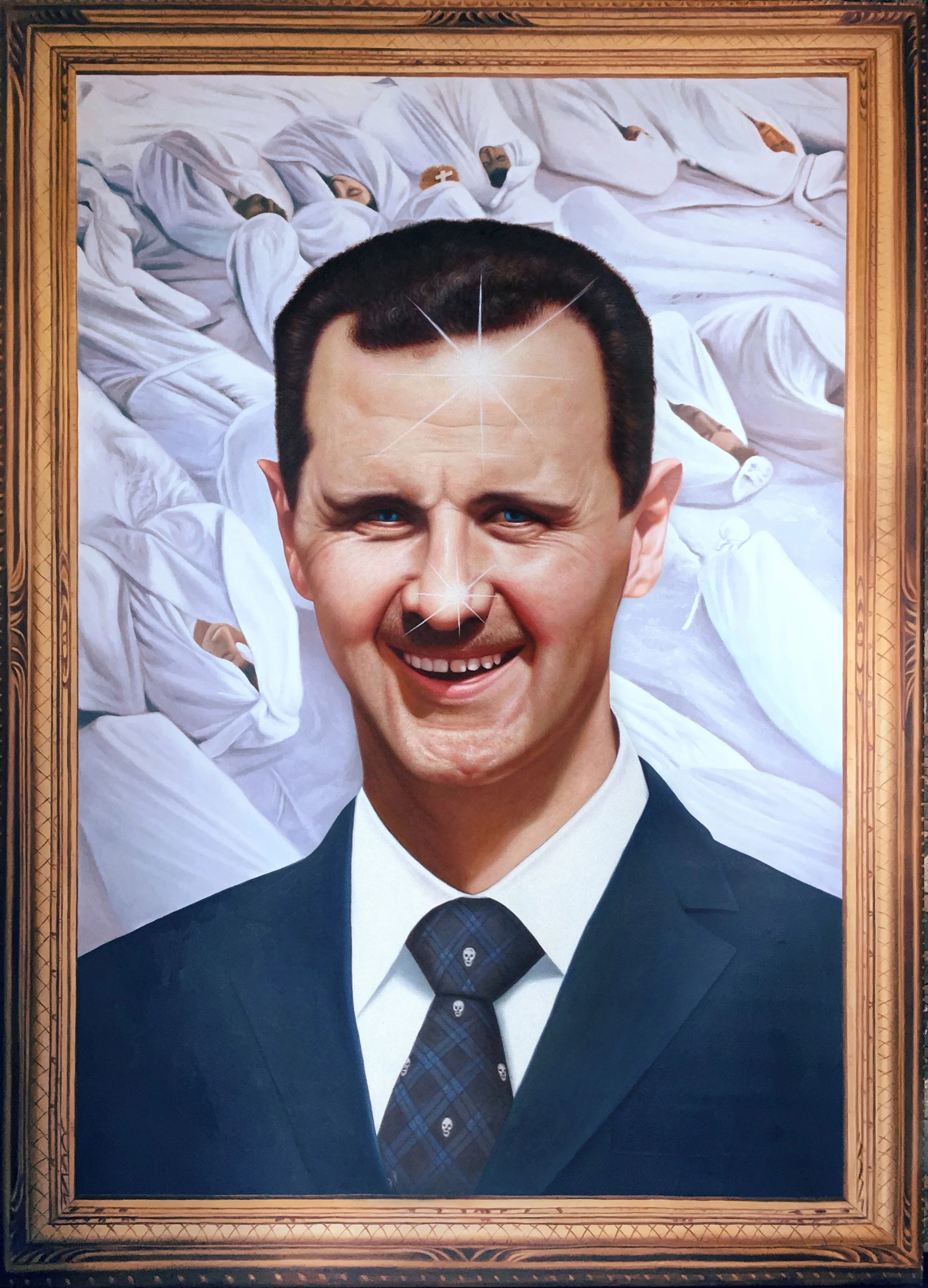 Bashar al-Assad is one of the worst dictators today. Large intimidating propaganda posters are all over the streets. He said he wanted to be remembered 10 years from now as the person who saved Syria (according to an interview with the Spanish newspaper El Pais, in February 2016). In the background of the slightly changed official portrait, with an Alexander McQueen tie and the devil in his eyes, the victims of the sarin gas attacks in Ghouta, east of Damascus in 2013, are shown. 1.429 people were killed, including at least 426 children.