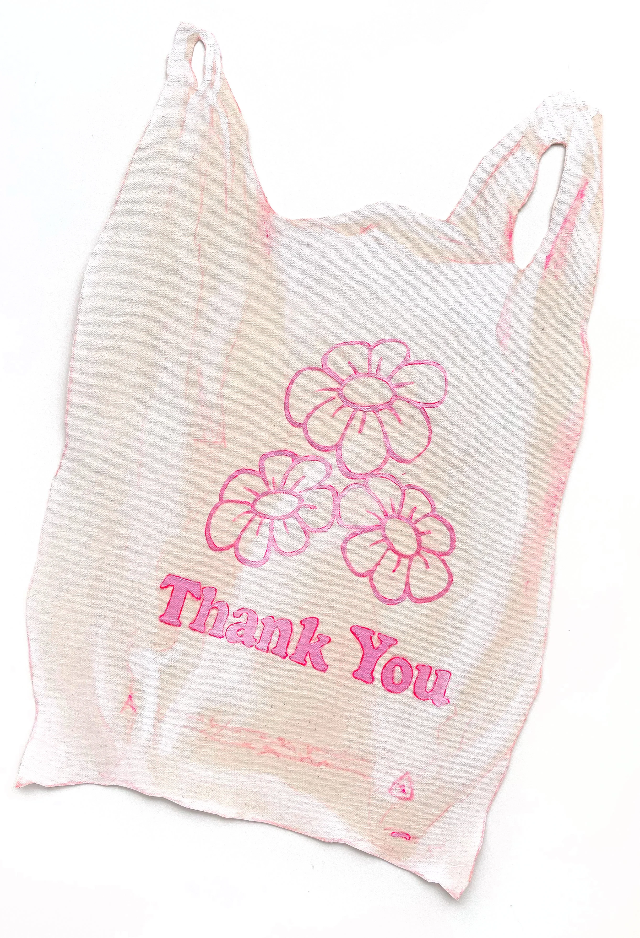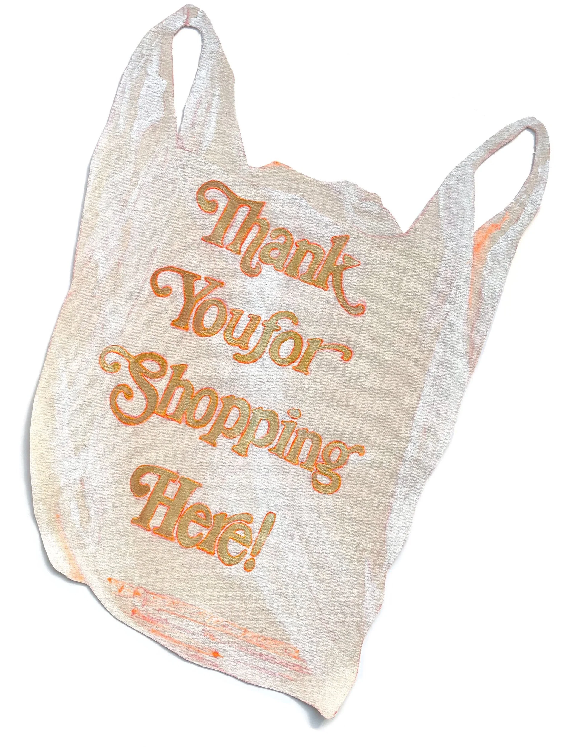 After the artist’s collection plastic shopping bags from New York City. Oil and acrylic on canvas, cut-out, 15x20inches (37x55cm)