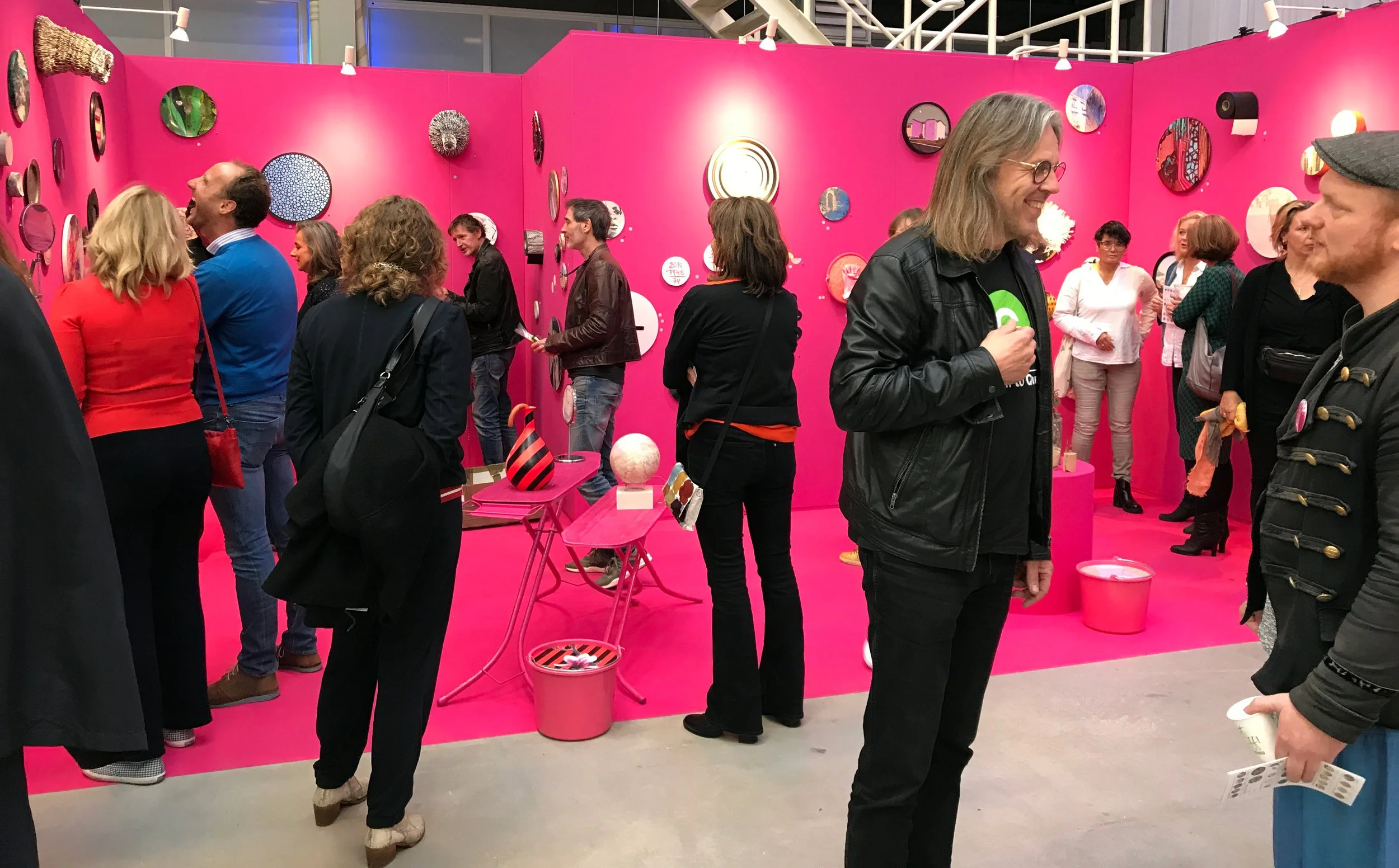 The artists of art collective Popinnart made round art and the booth was bright 'Barbie' pink completed with 3 ironing boards. Queen Máxima of the Netherlands visited and was excited.