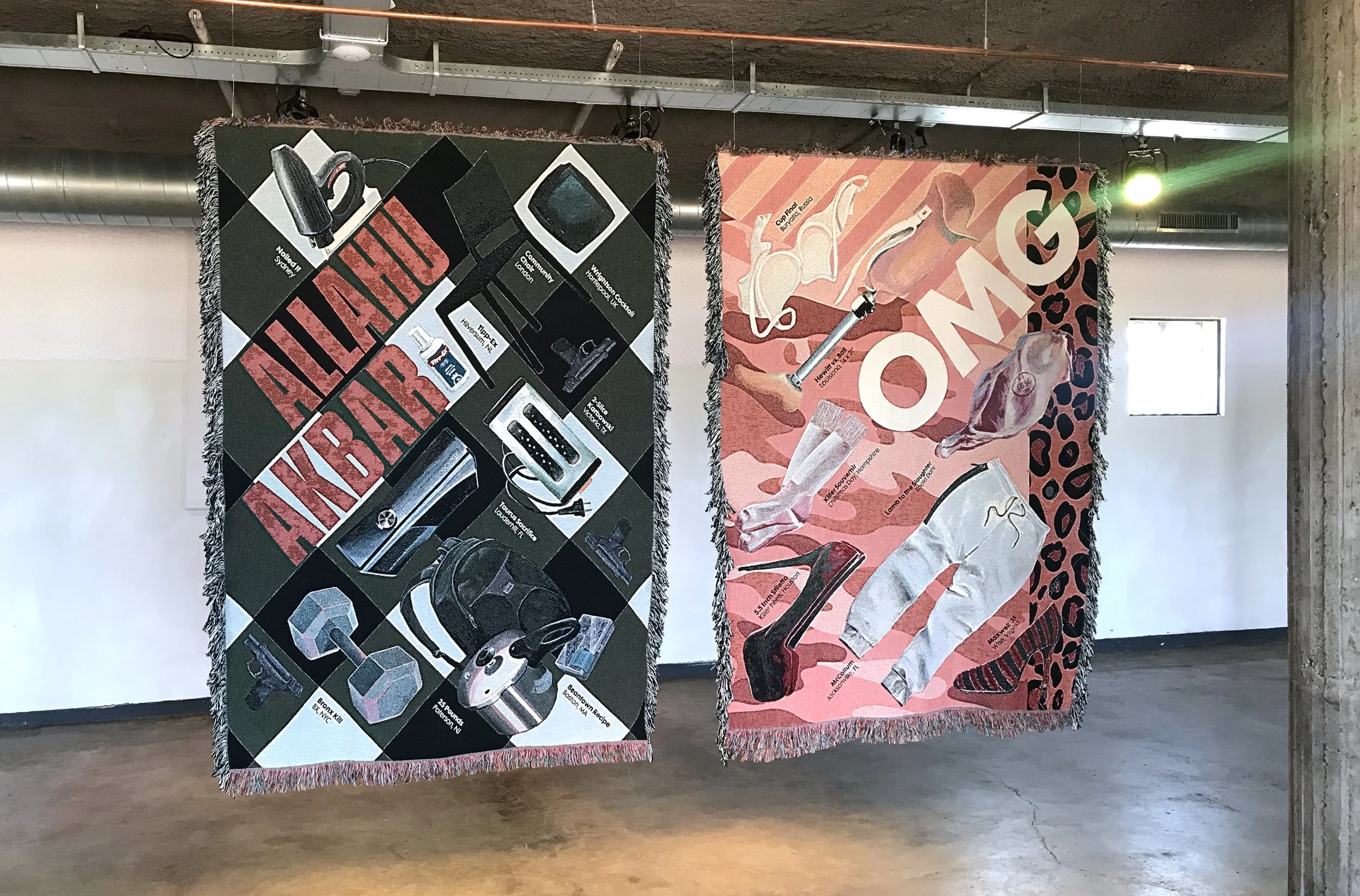 Collages of paintings from the series 'Weapon: Other', unusual murder weapons. Wall tapestry, 100% cotton, 50x60” (125x150cm), 2017