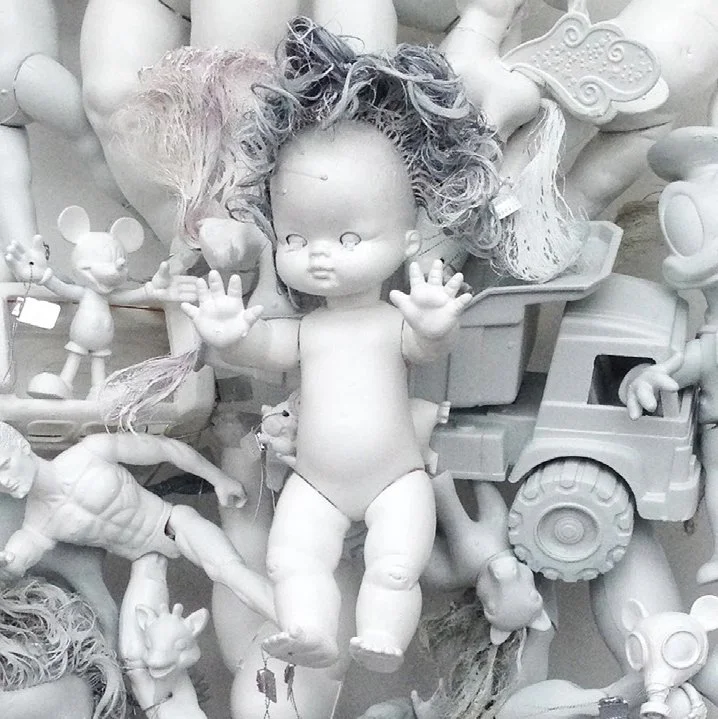 In the five years of the Syrian war, approximately 12,000 children were killed. The light grey toys symbolize the loss of lives. The color also refers to the ruined buildings by the bombings... everything turns grey, in every sense of the word. The baby dolls show us the innocence of the children; the my little ponies speak for dreams and freedom, Mickey Mouse and Donald Duck refer to the US, both the American Dream and their sometimes questionable efforts in the Middle East. The toys represent all the belongings refugees have to leave behind. There’s also a toy camera and a small boat. This installation tells the story of the Syrian children: war, deaths, refugees, and hope.