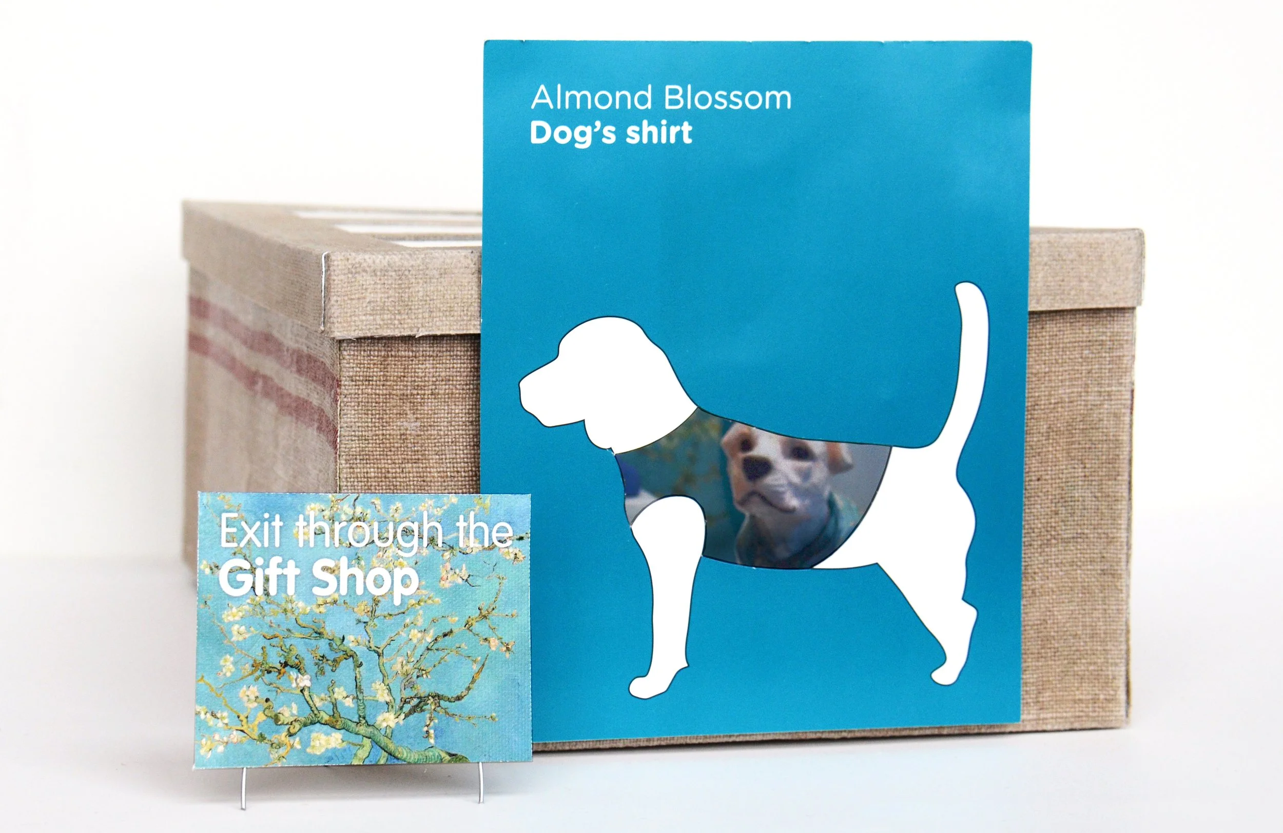 The box was made with a French linen tea towel on which Van Gogh used to paint. The package of an almond blossom dog shirt was used as the peephole.